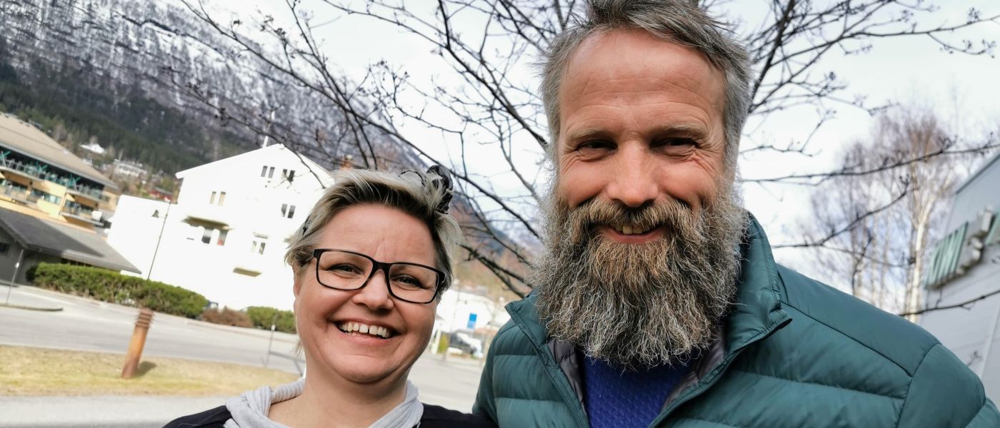 Karin Gregersen Vik og Jann Aasbak (organisasjonssjef i HELT MED) utenfor lokalene til In Via i Stryn