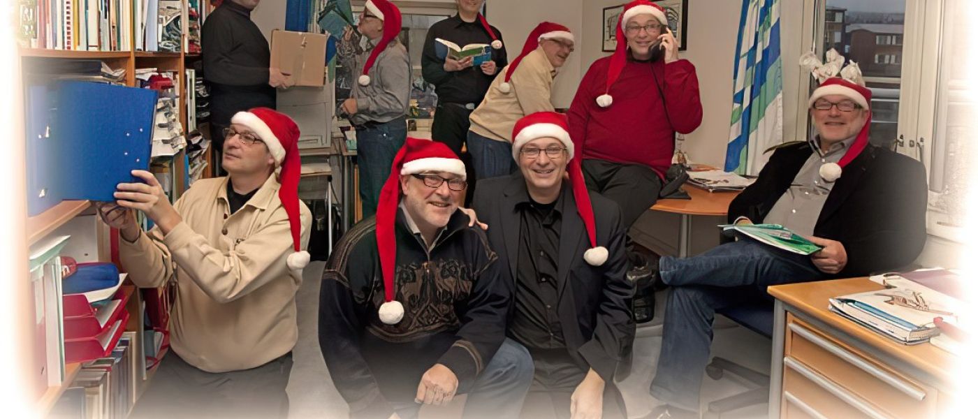 Den kommentaren er bakgrunnen for julebildet fra SOR kontoret, julen 2009. Ni blide karer jobber og står på, ser det ut til. Men alle personene er Tormod og meg. Fotoshoppet av min sønn Mikkel.