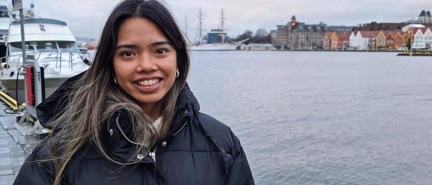 Ine, med bryggen i Bergen i bakgrunnen. Foto: Jarle Eknes