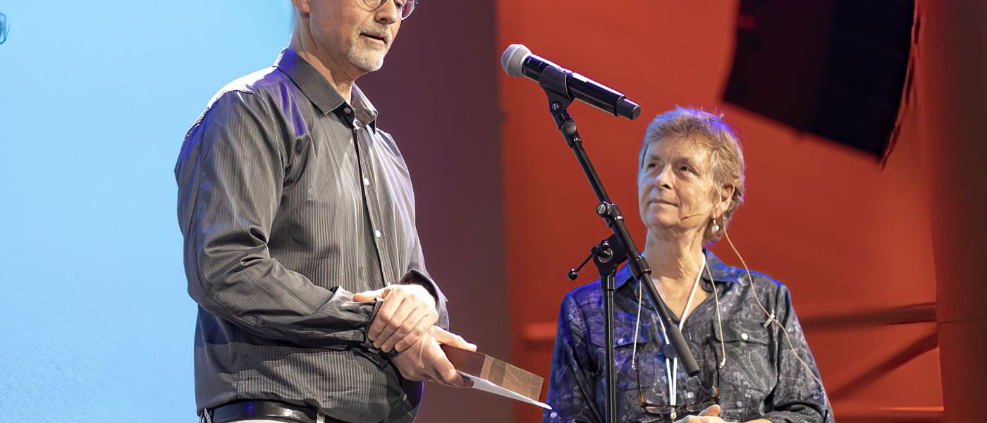 Trine Lise Bakken deler ut SOR-prisen 2022 til Thomas Owren. Foto: Olav Helland